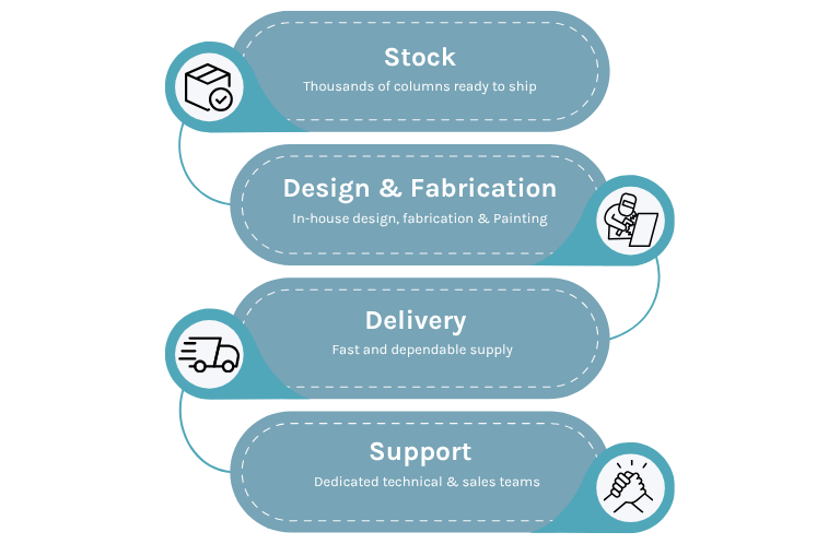 We settle that demand with a dedicated external sales/support team, thousands of columns in stock and a suite of design, fabrication and painting facilities.